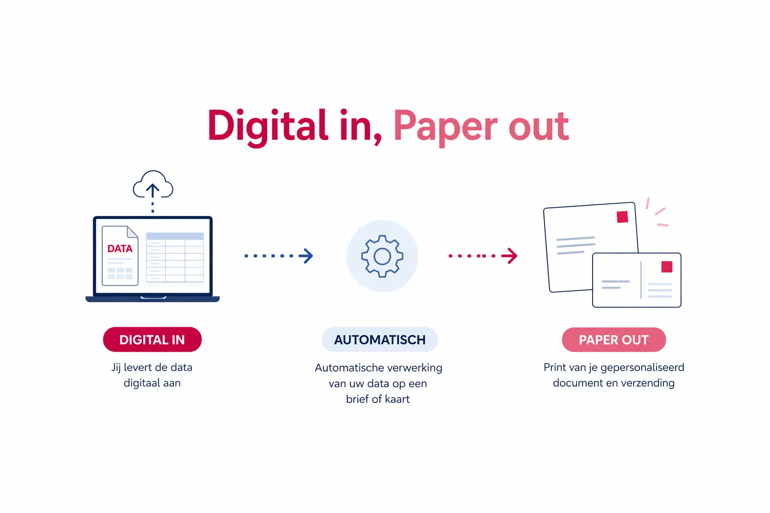 Alles start met data. Jij levert digitale input aan, wij zorgen voor een feilloze vertaalslag naar gepersonaliseerde, fysieke communicatie. Jawel: print!
