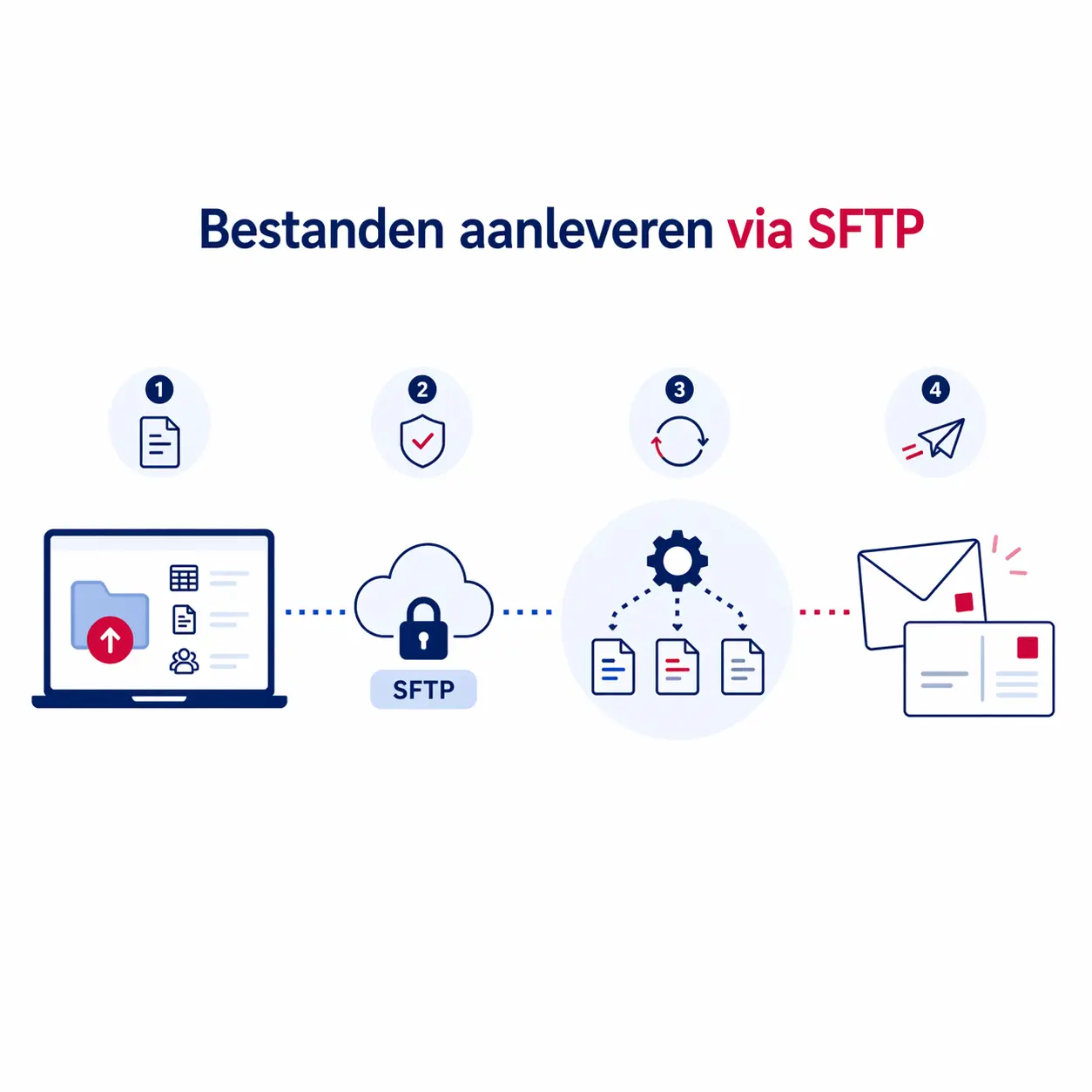 Werk je liever met batchverwerking? Dan kan je bestanden veilig aanleveren via SFTP. Dit is een eenvoudige manier om datafiles, printbestanden en mailinglijsten automatisch door te sturen naar ons systeem.