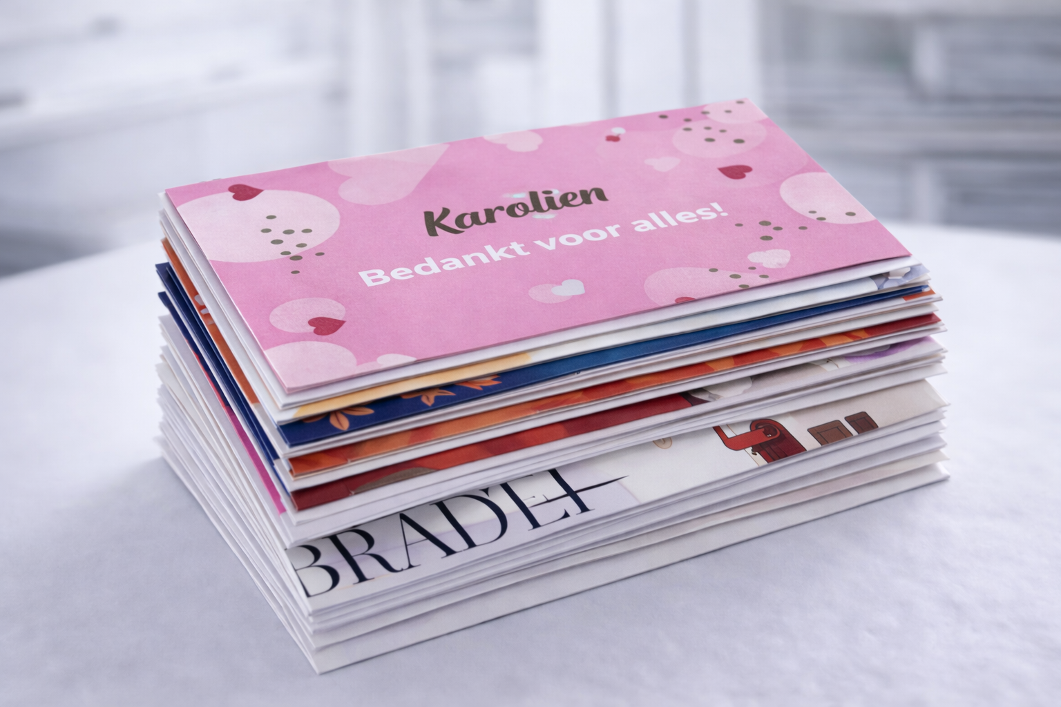 A5, A6 of Amerikaans formaat: de klassiekers die altijd werken. Liever iets unieks? Dat kan zeker, we denken graag met je mee binnen de postrichtlijnen.